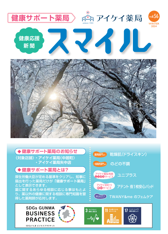 《健康応援新聞》スマイル 2024年冬号 vol.56を配布しております。【主な内容】・乾燥肌(ドライスキン)・のどの不調・福祉用具レンタルサービスより:ユニプラス・おむつ給付サービスより:アテント 夜1枚安心パッド・TWANY&me のフェムケア